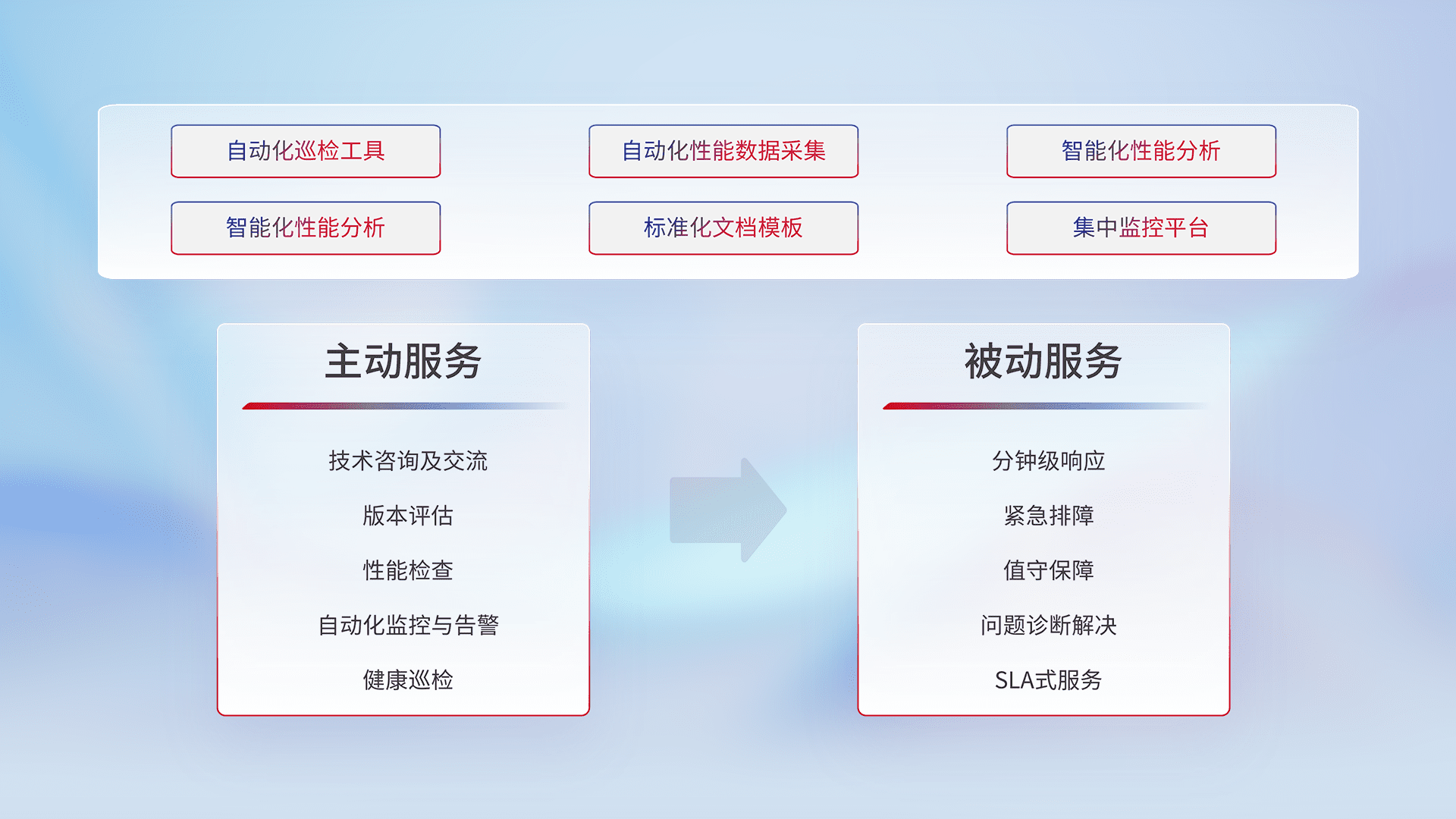 智能化工具和标准化文档,,保障服务质量,,提供主动服务(包含技术咨询、、、版本评估、、性能检查、、自动化监控与告警、、、、健康巡检)和被动服务包含(分钟级响应、、、紧急排障、、、、值守保障、、、、问题诊断解决、、、SLA服务)。。。